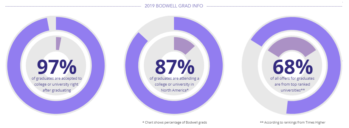 Bodwell High School 은 탁 트인 해안가에 위치해 있으며, 밴쿠버 다운타운이 보이는 최상의 뷰를 자랑하고 있습니다. 교육열이 높은 중산층 이상이 생활하는 지역인 노스밴쿠버에 위치해 있어 많은 부모님들이 지역적으로도 만족하고 계십니다. 학교 내에는 2개의 카페테리아, 넓은 운동장, 실내 수영장, 상영관 2개, 체육관 2개, 과학실, 테니스장, 도서관, 음악실 등이 갖춰져 있어 어느 국제학교보다 최신 캠퍼스를 자랑합니다. 넓은 교실에서는 평균 18명의 학생들이 수업에 집중하고 있으며, 24시간 학교 생활을 하는 보딩스쿨인 만큼 최신시설에서 안락한 학교생활을 하고 있습니다.
